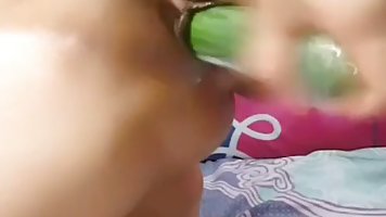 Horny, amateur babe is masturbating with a cucumber in front of the web camera and enjoying it