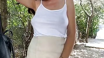 Busty, amateur brunette is fingering her pussy in front of the camera, in the backyard
