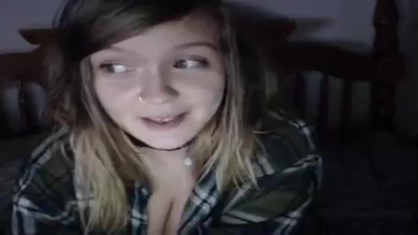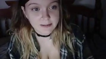 Horny teen babe is showing her very big tits, while in front of the webcam